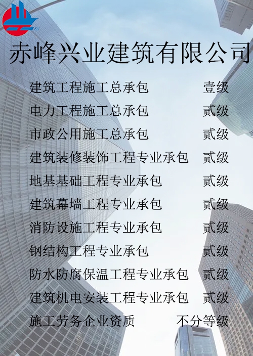 赤峰興業(yè)建筑有限公司簡(jiǎn)介 赤峰興業(yè)建筑有限公司成立于1998年7月,位于內(nèi)蒙古赤峰市松山區(qū)?,F(xiàn)已發(fā)展成為擁有建筑工程施工總承包壹級(jí)、電力工程施工總承包貳級(jí)、市政公用工程施工總承包貳級(jí)、承裝、修、試四級(jí)、?建筑裝修裝飾工程專業(yè)承包貳級(jí)、建筑幕墻工程專業(yè)承包貳級(jí)、消防設(shè)施工程專業(yè)承包貳級(jí)、地基基礎(chǔ)工程專業(yè)承包貳級(jí)、鋼結(jié)構(gòu)工程專業(yè)承包貳級(jí)、建筑機(jī)電工程專業(yè)承包二級(jí)、防水防腐保溫工程專業(yè)承包貳級(jí)以及建筑施工勞務(wù)等資質(zhì)的綜合性建筑施工企...